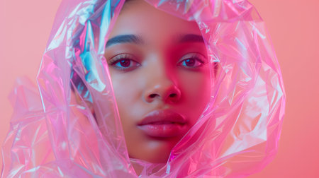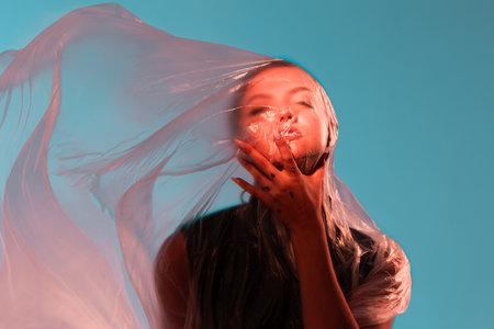 Female character. Gorgeous woman. Disturbed insecure girl hiding behind wrinkled polyethylene film on pink blue color gradient glow out of focus background.