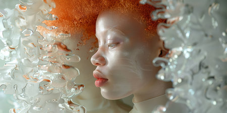 A person with albinism and orange colored hair gazing at their reflection in a mirror. International Albinism Awareness Day concept.