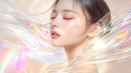 Stunning portrait of a young Asian woman with glowing iridescent lights.