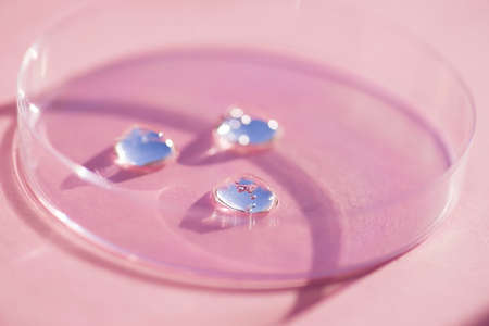 Transparent drops of cosmetic product serum gel in petri dish. Liquid texture with bubbles on pink background. Skincare products, natural cosmetic. Beauty concept for face and body care