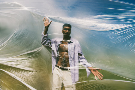 african american man in shirt and necklace standing with closed eyes under cellophane film, banner