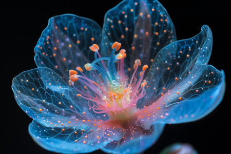 A close-up of a hypnotizing flower with translucent petals that glow, showcasing intricate designs and details. The captivating interplay of color and light creates a magical effect.