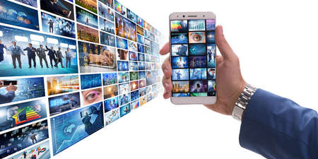A hand holds a smartphone showing various colorful images, suggesting a wide range of multimedia entertainment options being accessed.