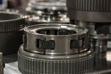 Gearbox cross-section, engine industry, sprockets, cogwheels and bearings of automotive transmission for oversize trucks, SUV, cargo, commercial and construction vehicles, selective focus