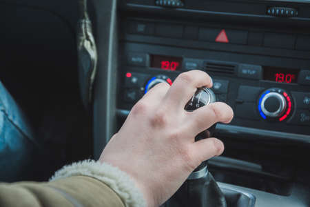 Manual transmission in the car, six gears in the car, gear lever in the car close up.