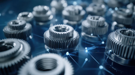 Explore a captivating close-up of interlocking metallic gears showcasing intricate details and reflections, symbolizing the synergy of engineering and technology.