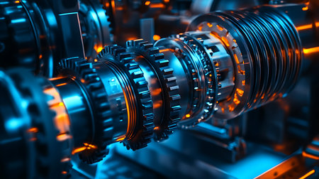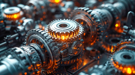 This captivating close-up image showcases intricate machinery gears featuring dynamic lighting and metallic textures, highlighting the beauty of mechanical design.