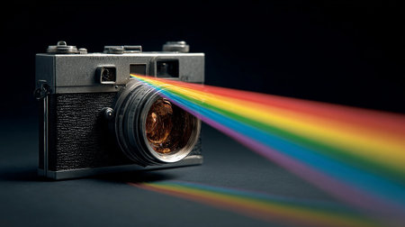 Retro film camera with rainbow colors on a black background. Selective focus.