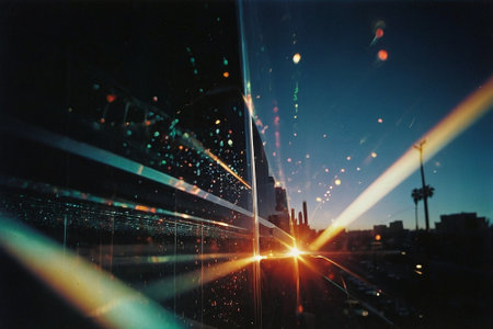 Dynamic abstract light trails over a cityscape, combining vibrant neon colors and blurred urban lights for a futuristic effect.
