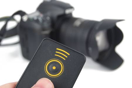 Hand holding a glowing camera icon projecting data onto a digital world map display. Clear detail...