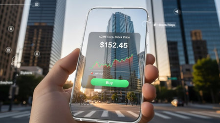 The image shows a person holding a smartphone displaying the stock price of ACME Corp at $152.45. The phone screen also features a stock chart with a 'Buy' button highlighted. The background reveals a cityscape with tall buildings and a clear sky, indicating an urban setting. The person appears to be standing on a street, possibly monitoring their investments while on the go.