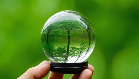 A hand holding a glass sphere that reflects vibrant forest leaves, symbolizing connection with nature and sustainability.