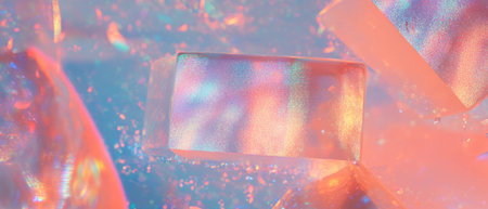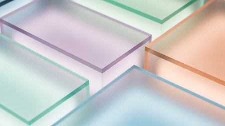 Stacked translucent glass rectangles in soft pastel colors with subtle lighting. Clear details and vibrant col...