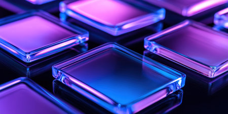 Close-up of multiple transparent rectangular plates with rounded corners, glowing in blue and purple colors on a black background, arranged at different angles to create an abstract geometric pattern. The composition emphasizes the interplay between light and shadow through reflections on each plate's surface. High resolution. --ar 2:1 --v 6.1 Job ID: 2a3074f7-1a1a-4afd-9e66-e0c9921ed96a