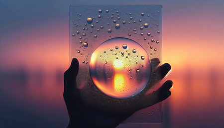 Hands holding a water drop on a glass panel with sunset background
