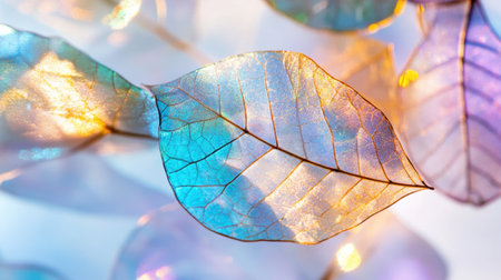 A visually striking arrangement of translucent skeleton leaves creates an abstract pattern with a gradient of pink, purple, and blue light.