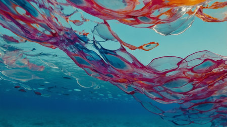 Ocean surface is cluttered with floating plastic, including bottles and bags, showing the severe issue of marine pollution today.