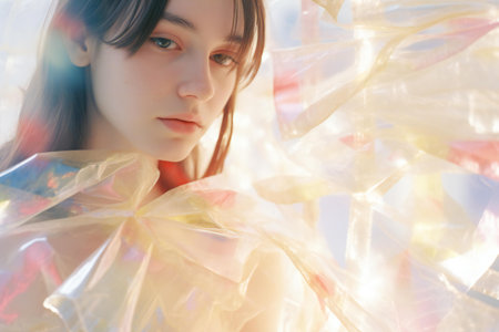 Portrait of a beautiful girl in a transparent plastic raincoat.