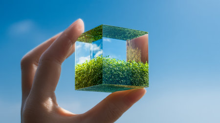 A hand gently supports a clear geometric prism containing lush grass, mirroring a vibrant sky? embodying harmony between nature and human stewardship.