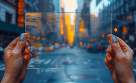 A hand interacts with floating display screens showcasing vibrant cityscapes. This image represents the fusion of technology and urban exploration in modern design.