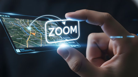 Hand interacts with holographic zoom icon and aerial city map display showing urban streets.