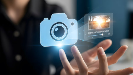 Hand holding a holographic camera icon with an exposure compensation preview screen Clear details...
