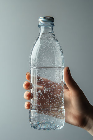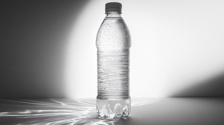 A clear water bottle with condensation and droplets stands prominently against a minimalist light backdrop, highlighting the themes of freshness and hydration.