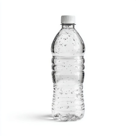 A clear plastic water bottle sits isolated on a white background, showcasing condensation droplets that emphasize freshness and hydration. Perfect for drink concepts.