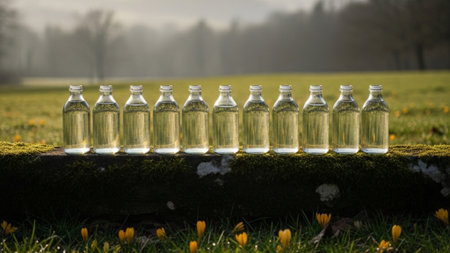 The water-filled glass bottle glistens in gentle light, creating a calm atmosphere.
