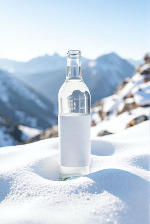 a glass mineral water bottle in a snowy mountain landscape with sharp, snow-covered peaks under a clear blue sky.