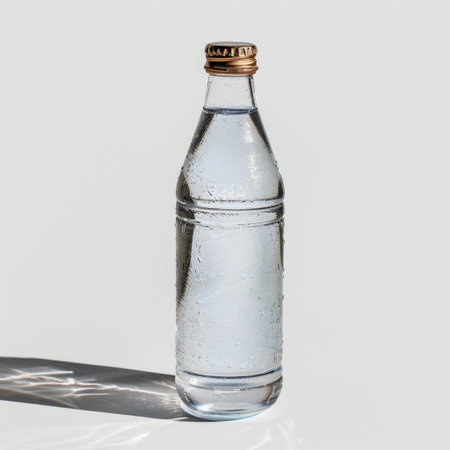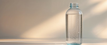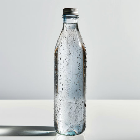 A clear bottle filled with mineral water displays beautiful condensation, symbolizing freshness and hydration against a bright, minimalist backdrop.