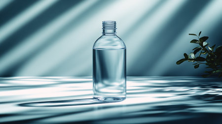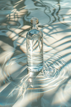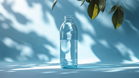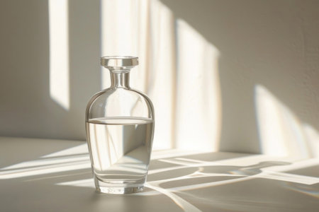 Elegant glass bottle with water casting soft shadows in filtered sunlight, creating a serene and minimalist ambiance. Generated A.I.