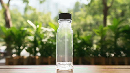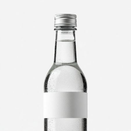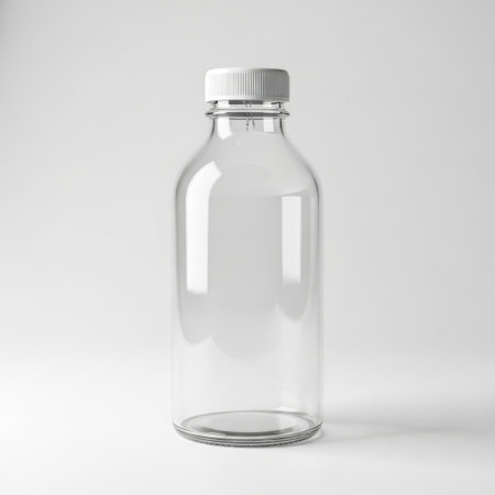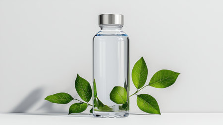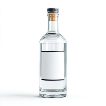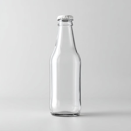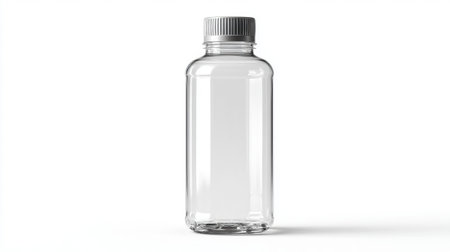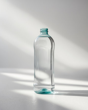 A clear glass bottle stands elegantly on a white surface, showcasing its minimalist design and perfect for use in various creative and advertising projects.