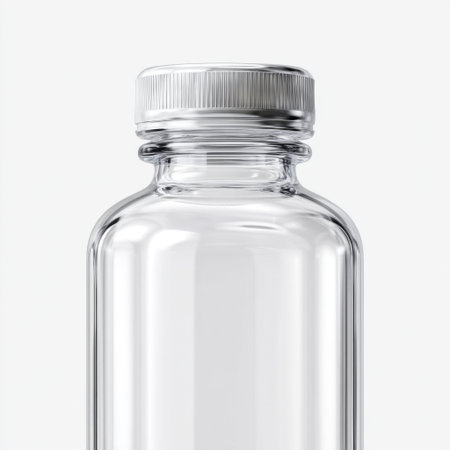 This image features a clear glass bottle with a sleek metal lid, perfect for showcasing beverages or liquid products in a stylish manner.
