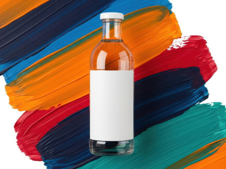 Bottle of liqueur on colorful background. Mockup for design
