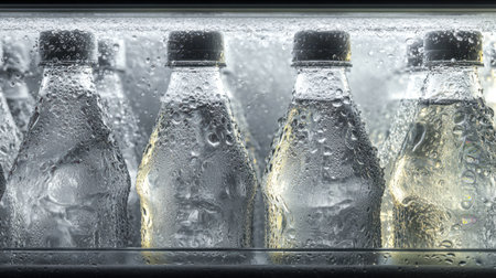 Refreshing, chilled bottles glisten with droplets, neatly arranged in a cool, crisp kitchen refrigerator, evoking purity and readiness for hydration.