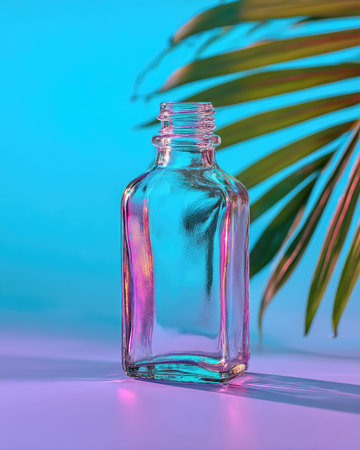 Clear glass bottle with neon lighting and tropical foliage.