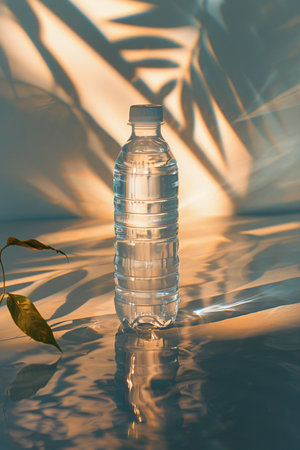 A plastic water bottle filled with clear liquid sits on a shimmering, wavy surface. Dramatic plant shadows create a natural pattern on the backdrop.