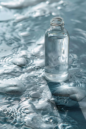 A transparent glass bottle containing pure water is placed in rippling water, creating reflections and a refreshing feel.