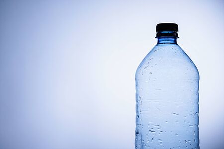 Clear plastic bottle of chilled water or liquid with condensation droplets on the surface of the bottle over blue with copy space