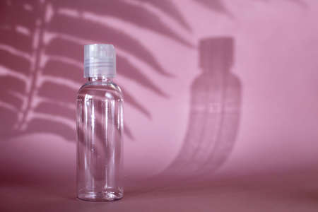 Isolated spa cosmetic products, transparent tube, branding mockup on a pink background. Plastic bottle for detergent cleaning agent. hard shadows. copy space