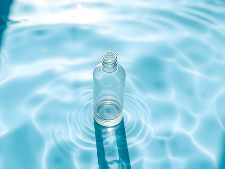 Clear Glass Water Bottle Floating in Crystal Blue Swimming Pool with Sun Glare Ripples, and Refreshing Summer Vibe for Healthy Lifestyle Hydration and Pure Mineral Water Branding Mockup Background.