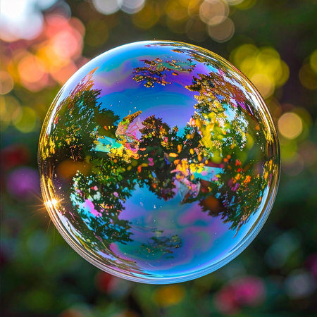 A single, iridescent soap bubble floats delicately in the air, capturing a vibrant, upside-down reflection of a sunlit garden within its fragile sphere.