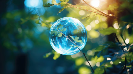 Abstract sphere of multi colored bubbles reflects nature beauty outdoors generated by artificial intelligence