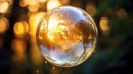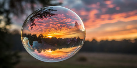 A transparent soap bubble sits on a reflective surface, showcasing a sunset reflected within. The image displays vibrant colors, with the bubble mirroring the orange and purple hues of the sky. The composition emphasizes the play of light and reflection, creating a sense of serenity. Suitable for various visual communication projects.