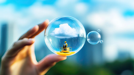 A person works within a bubble while holding it, capturing a vibrant cityscape and fluffy clouds.