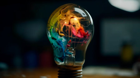 A stunning visual of a light bulb filled with a vibrant explosion of colors, showcasing the essence of creativity and imagination against a dark background.
