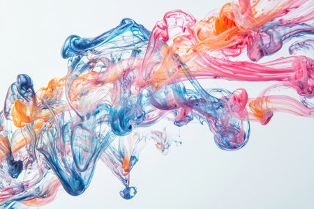 A swirling motion of vibrant liquid ink colors blending in clear water, forming abstract patterns against a clean white background.