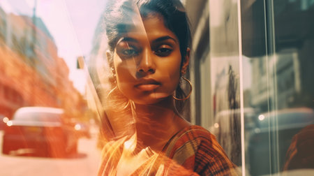 Street dreamy photo sad woman model window looking at camera portrait reflection soft vintage glare