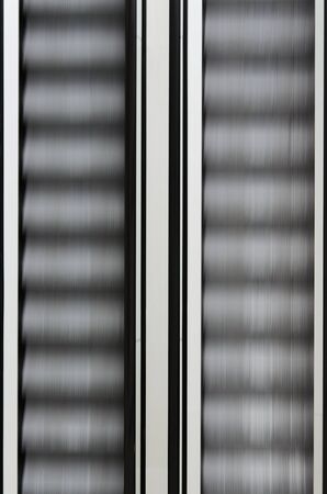 Architecture detail: pair of modern escalators in motion, one going up and the other going down, without people, frontal view